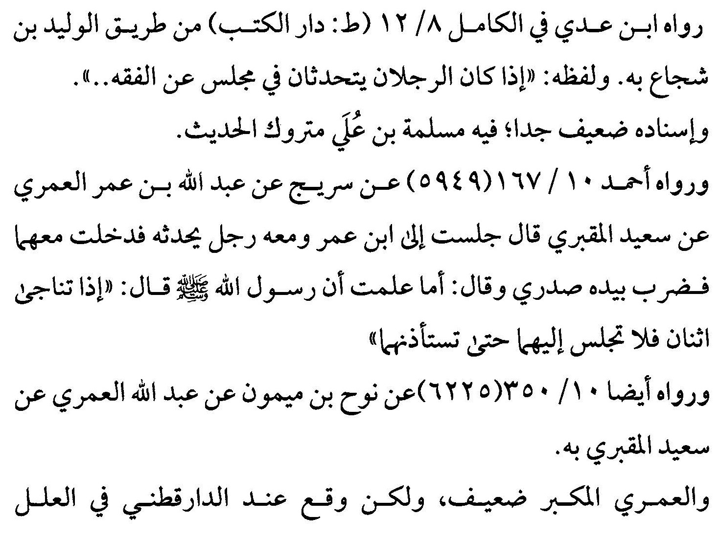 172 - فقد حدثني أحمد بن يحى بن زهير، ثنا محمد بن عبد اللّه بن عبيد بن عقيل: ثنا عبد الملك بن بشير: ثنا دُرُست(1) بن الحسن المؤذِّن، ثنا جعفر بن الزبير ، عن القاسم ، عن أبي أمامة ، قال : قال رسول اللّه صلى الله عليه وسلم: "مَن تخطَّى حَلْقةَ قوم بغير إذنهم، فهو عاص" (2). والحمد للّه رب العالمين ، ورضي الله على سيد المرسلين محمد النبي وآله أجمعين ، وحسبنا اللّه ونعم الوكيل. يتلوه إن شاء اللّه : فإن استدناه العالم. ----------------------------------- (1) كذا رسم : (درست)، ولم أجد له ترجمة، بل لم أجد من ذكر في تلاميذ من رووا عنه، ولا في شيوخ من روى عنه من اسمه كذلك، بل من نسبه: ابن الحسن المؤذن، واسم درست معروف عند أهل الحديث، منهم: درست بن زياد العنبري، ويحيى بن درست، وهو من شيوخ النسائي. (2) أخرجه الطبراني في «الكبير» (8/ 246) من طریق جعفر بن الزبير، وقال الهيثمي في مجمع الزوائد (8/ 62): «رواه الطبراني، وفيه جعفر بن الزبير، وهو متروك»، وأقره الشيخ الألباني في «الضعيفة» (2805) إلا أنه قال في الحديث: ضعيف جدا أو موضوع، وسبب ذلك أن شعبة كذبه، فقال غندر: رأيت شعبة راكبا على حمار، فقال: اذهب فاستعد على جعفر بن الزبير، وضع على رسول الله أربعمائة حديث، كما في الميزان. |
