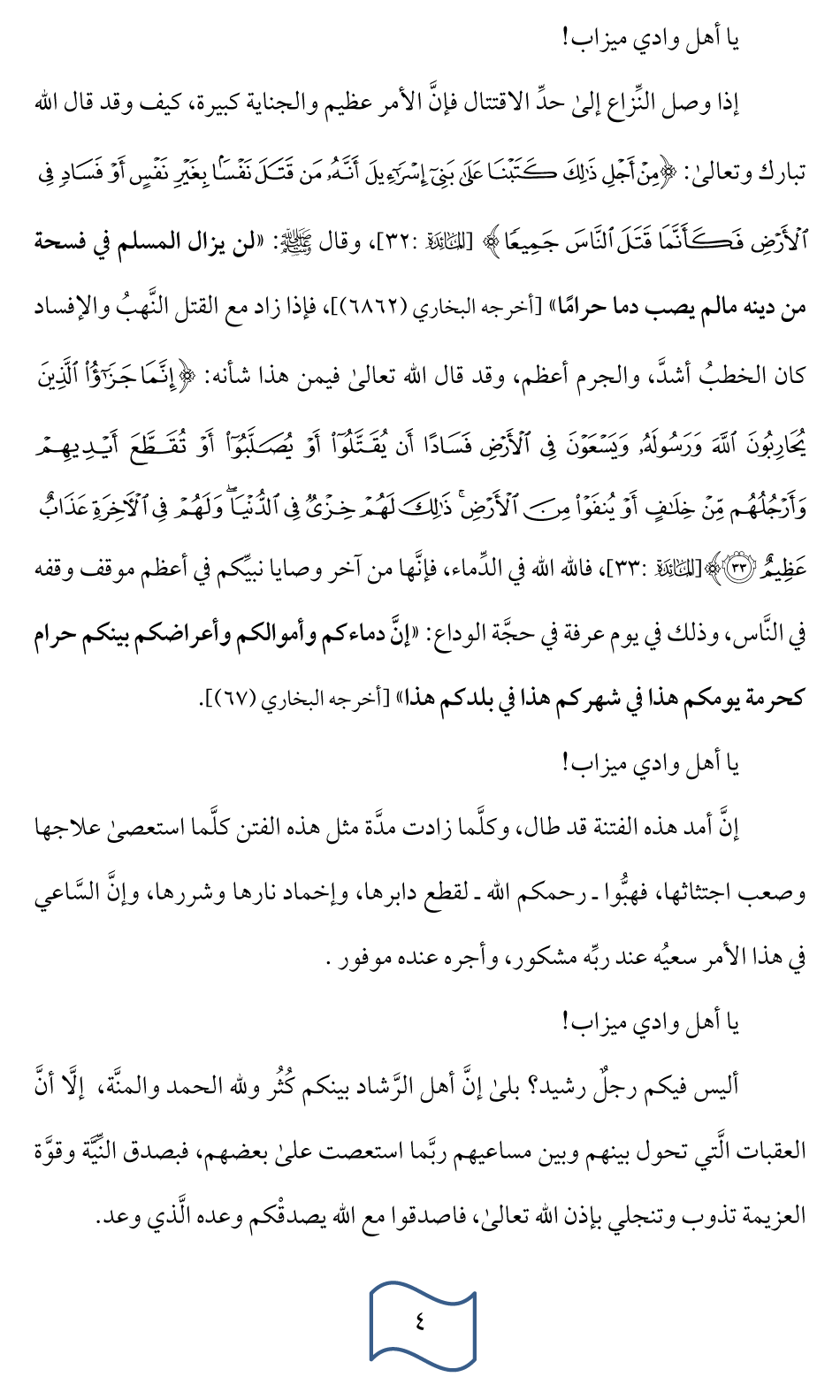 إنها حقا لكلمات موجزات تهتز لمعانيها الجبال والهضبات. نسأل الله تعالى أن يجمع كلمتنا على البر والتقوى وأن يلهمنا طريقة السلف الصالح التي هي أولى. كما نسأله جل وعلا أن يجنبنا الفتن ما ظهر منها وما بطن. آمين. |