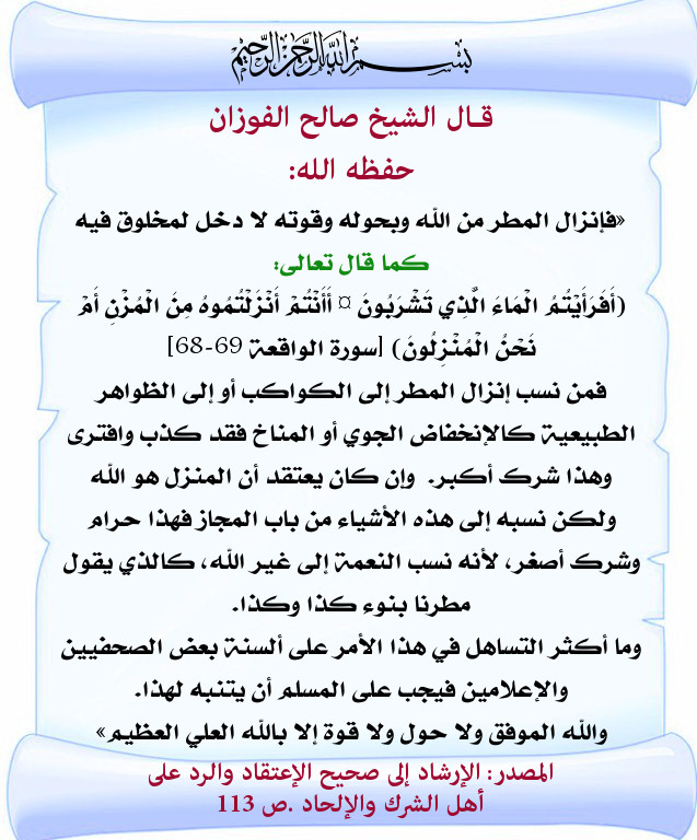 قال ابن عثيمين رحمه الله: تعليق المطر بالضغط الجوي، والمنخفض الجوي -وهو وإن كان قد يكون سببًا حقيقيًّا- ولكن لا ينبغي فتح هذا الباب للناس، بل يقال: هذا من رحمة الله، هذا من فضله ونعمته، قال الله تعالى: {أَلَمْ تَرَ أَنَّ اللَّهَ يُزْجِي سَحَابًا ثُمَّ يُؤَلِّفُ بَيْنَهُ ثُمَّ يَجْعَلُهُ رُكَامًا فَتَرَى الْوَدْقَ يَخْرُجُ مِنْ خِلَالِهِ} وقال عز وجل: {اللَّهُ الَّذِي يُرْسِلُ الرِّيَاحَ فَتُثِيرُ سَحَابًا فَيَبْسُطُهُ فِي السَّمَاءِ كَيْفَ يَشَاءُ وَيَجْعَلُهُ كِسَفًا فَتَرَى الْوَدْقَ يَخْرُجُ مِنْ خِلَالِهِ} فتعليق المطر بالمنخفضات الجوية من الأمور الجاهلية التي تصرف الإنسان عن تعلقه بربه. وليعلم أن النسبة تنقسم إلى ثلاثة أقسام: القسم الأول: نسبة إيجاد وهذه شرك أكبر. القسم الثاني: نسبة سبب وهذه شرك أصغر. القسم الثالث: نسبة وقت وهذه جائزة. والله أعلم. مجموع فتاوى ورسائل العثيمين(2/193) http://www.tasfiatarbia.org/vb/attac...1&d=1454931800 قال الشيخ صالح الفوزان -حفظه الله تعالى-: فإنزال المطر من الله وبحوله وقوته لا دخل لمخلوق فيه كما قال تعالى: (أَفَرَأَيْتُمُ الْمَاءَ الَّذِي تَشْرَبُونَ ¤ أَأَنْتُمْ أَنْزَلْتُمُوهُ مِنَ الْمُزْنِ أَمْ نَحْنُ الْمُنْزِلُونَ) [سورة الواقعة 69-68] فمن نسب إنزال المطر إلى الكواكب أو إلى الظواهر الطبيعية كالإنخفاض الجوي أو المناخ فقد كذب وافترى وهذا شرك أكبر. وإن كان يعتقد أن المنزل هو الله ولكن نسبه إلى هذه الأشياء من باب المجاز فهذا حرام وشرك أصغر، لأنه نسب النعمة إلى غير الله، كالذي يقول مطرنا بنوء كذا وكذا. وما أكثر التساهل في هذا الأمر على ألسنة بعض الصحفيين والإعلامين فيجب على المسلم أن يتنبه لهذا. والله الموفق ولا حول ولا قوة إلا بالله العلي العظيم. المصدر: الإرشاد إلى صحيح الإعتقاد والرد على أهل الشرك والإلحاد .ص 113 http://www.tasfiatarbia.org/vb/attac...1&d=1454931800 تنبيه: أسمح بنشر هذه البطاقات في المواقع والمنتديات حتى يستفاد منها جديد بطاقاتي الدعوية: المجموعة 23: تحتوي على 160 بطاقة دعوية لأقوال السلف والعلماء الموثوقين بحجم 16 ميجا فقط لتحميل هذه المجموعة اضغط هنا ◄باقي المجموعات تجدها هنا ◄ تحميل مطويات ◄ تحميل متون عليمية صوتية ◄ تحميل شروحات المتون لطالب العلم قناة بطاقات ومطويات سلفية على التيليغرام: https://telegram.me/bita9at |