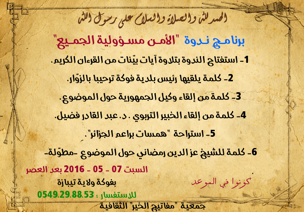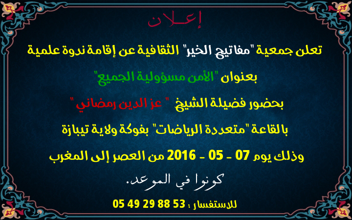 إعـــلان تعلن جمعية "مفاتيح الخير" الثقافية عن إقامة ندوة علمية بعنوان "الأمن مسؤولية الجميع" بحضور فضيلة الشيخ " عز الدين رمضاني " بالقاعة "متعددة الرياضات" بفوكة ولاية تيبازة وذلك يوم 07 - 05 - 2016 من العصر إلى المغرب كونوا في الموعد. للاستفسار : 53 88 29 49 05 http://www.tasfiatarbia.org/vb/attac...1&d=1462017183 ساهم معنا في النشر لا حرمك الله الأجر |