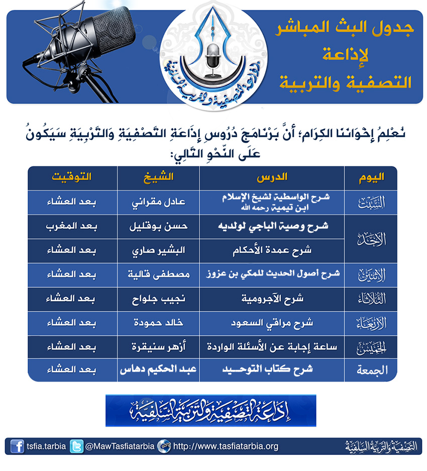 http://tasfiatarbia.org/Up/dd.png بشرى : ندوة افتتاحية لإنطلاق الموسم الثالث لدروس إذاعة التصفية والتربية السلفية يسرنا أن نزف الى مستمعينا ومتابعينا الأعزاء خبر انطلاق الموسم الثالث لدورس إذاعة التصفية والتربية السلفية وستكون هناك ندوة افتتاحية لبعض مشائخنا الأفاضل يوم غد السبت إن شاء الله على الساعة الخامسة مساءًا فكونوا في الموعد ودلوا على الخير فالدال على الخير كفاعله http://www.tasfiatarbia.org/vb/attac...1&d=1414785410 وقد طرأ تغيير بسيط على جدول برنامج الدروس وهو كالتالي http://www.tasfiatarbia.org/vb/attac...1&d=1475869424 http://www.tasfiatarbia.org/vb/attac...1&d=1414785410 كما تم إضافة العديد من الدروس المسجلة التي تبث على مدار الساعة في اليوم والليلة أيضا تم انشاء القناة الثانية للإذاعة نستعملها في حالة تعارض الدروس المباشرة http://www.tasfiatarbia.org/vb/data:...AAAElFTkSuQmCChttp://www.tasfiatarbia.org/vb/attac...1&d=1475869959 والمرجوُّ من إخواننا أهلِ المودَّة والطِّيب، إعانَتُنا بملاحظة هادفة، أو نصيحة صادقة، أو دعوة بظهر الغيب، وآخر دعوانا أن الحمد لله ربِّ العالمين. http://www.tasfiatarbia.org/vb/attac...1&d=1414785410 |