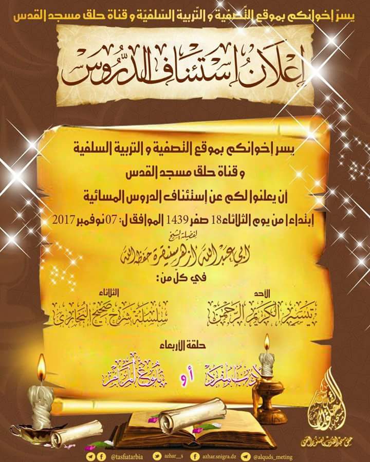 • إبتداءا من يوم: الثلاثاء 18 صفر 1439 لفضيلة شيخنا الوالد أبي عبد الله أزهر سنيقرة - حفظه الله تعالى - حيث سيكون البث - بإذن الله تعالى - متوفر عبر الإذاعة الرئيسية لموقع التصفية و التربية السلفية حسب البرنامج التالي : |