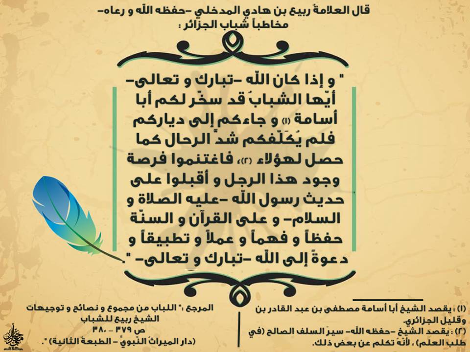 قال العلامةُ ربيع بن هادي المدخلي -حفظه الله و رعاه و جعله غصة في حلوق المبتدعة- مخاطباً شباب الجزائر :