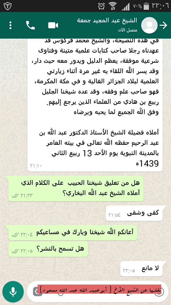 وكما قال شيخنا الأصولي عبد المجيد جمعة حفظه الله في تعليقه على كلام الشيخ عبد الله البخاري: " كفى وشفى"