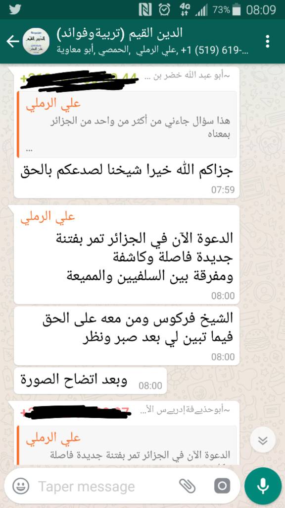 قال شيخنا علي الرملي حفظه الله وزاده توفيقا: الدعوة الآن في الجزائر تمر بفتنة جديدة، ة وكاشفة ومفرقة بين السلفيين والمميعة الشيخ فركوس ومن معه على الحق فيما تبين لي بعد صبر ونظر وبعد اتضاح الصورة.