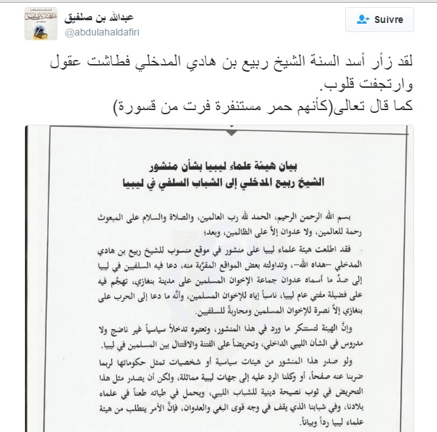 وخوان المسلمين في ليبيا وغيرها قد استمالوا بعض السلفيين في غرب البلاد، ويعلمون جيدا مكانة اﻹمام الربيع في قلوب السلفيين