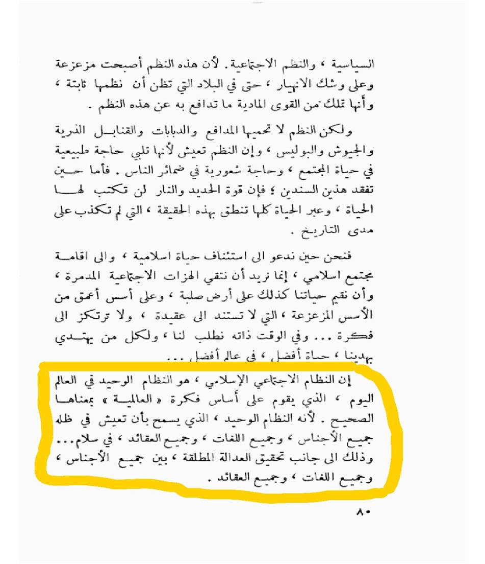 (ولا بد للإسلام أن يحكم، لأنه العقيدة الوحيدة الإيجابية الإنشائية التي تصوغ من المسيحية والشيوعية معا مزيجا كاملا يتضمن أهدافهما جميعا ويزيد عليهما التوازن والتناسق والاعتدال) . من كتاب معركة الاسلام والراسمالية