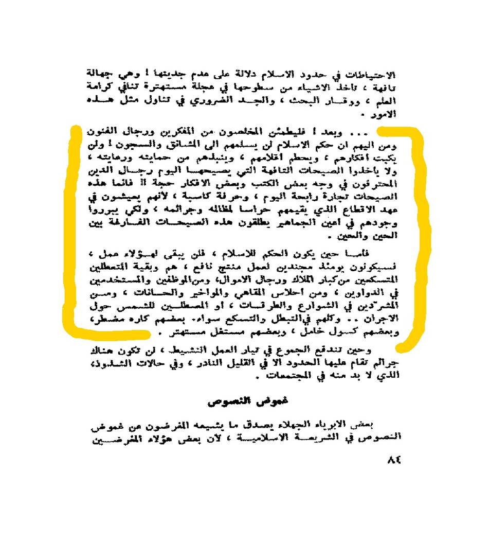 أقول: أي الشيخ ربيع أولا: من هم هؤلاء المخلصون من المفكرين ورجال الفنون الذين يخافون من حكم الإسلام. . . إلخ.ثانيا: ما هي أفكارهم التي يضمن لها سيد أنها لن تكبت وأن أقلامهم لن تحطم.فهل هم مسلمون؟يغلب على ظني أنهم الاشتراكيون والعلمانيون والشيوعيون وسائر مرضى القلوب والنفوس.وإذا كانوا كذلك، فهل الإسلام سيطلق لهم العنان ينشرون كفرهم وإلحادهم تسيل بهما أفواههم وأقلامهم المسمومة، وهل سيرعاهم الإسلام ويضمهم إلى كنف حمايته ورعايته؟