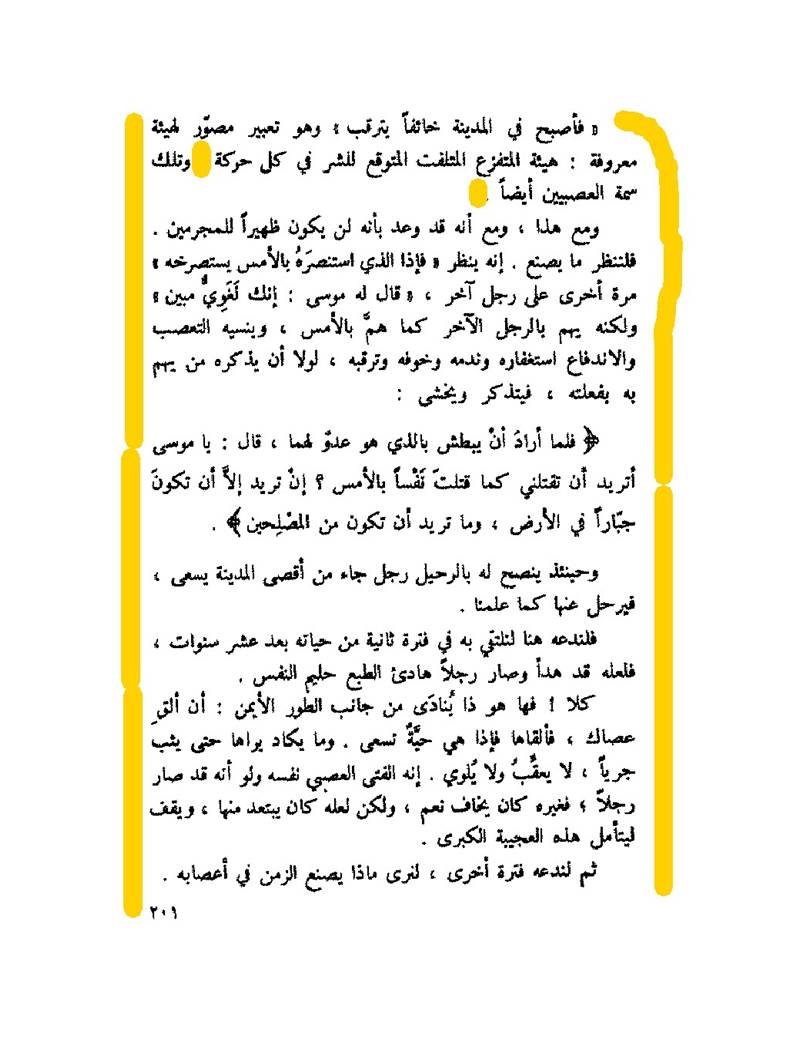 وهو تعبير مصور لهيئة معروفة: هيئة المتفزغ المتلفت المتوقع للشر في كل حركة، وتلك سمة العصبيين أيضاً.ومع هذا، ومع أنه قد وعد بأنه لن يكون ظهيراً للمجرمين؛ فلننظر ما يصنع ... إنه ينظر:] فَإِذَا الَّذِي اسْتَنصَرَهُ بِالأَمْسِ يَسْتَصْرِخُهُ . 18 القصص . مرة أخرى على رجل آخر!] قَالَ لَهُ مُوسَى إِنَّكَ لَغَوِيٌّ مُبِينٌ [. 18 القصصولكنه يهم بالرجل الآخر كما هم بالأمس، وينسيه التعصب والاندفاع استغفاره وندمه وخوفه وترقُّبه، لولا أن يذكره من يهم به بفعلته، فيتذكر ويخشى:] فَلَمَّا أَنْ أَرَادَ أَنْ يَبْطِشَ بِالَّذِي هُوَ عَدُوٌّ لَهُمَا قَالَ يَامُوسَى أَتُرِيدُ أَنْ تَقْتُلَنِي كَمَا قَتَلْتَ نَفْسًا بِالأَمْسِ إِنْ تُرِيدُ إِلا أَنْ تَكُونَ جَبَّارًا فِي الأَرْضِ وَمَا تُرِيدُ أَنْ تَكُونَ مِنْ الْمُصْلِحِينَ [. 19 القصصوحينئذ ينصح له بالرحيل رجل جاء من أقصى المدينة يسعى، فيرحل عنها كما علمنا.فلندعه هنا لنلتقي به في فترة ثانية من حياته بعد عشر سنوات؛ فلعله قد هدأ وصار رجلاً هادئ الطبع حليم النفس.كلا! فها هو ذا يُنادي من جانب الطور الأيمن: أن ألق عصاك. فألقاها؛ فإذا هي حيةٌ تسعى، وما يكاد يراها حتى يثب جرياً لا يعقبُ ولا يلوى ... إنه الفتى العصبي نفسه، ولو أنه قد صار رجلاً؛ فغيره كان يخاف نعم، ولكن لعله كان يبتعد منها، ويقف ليتأمل هذه العجيبة الكبرى.ثم لندعه فترة أخرى لنرى ماذا يصنع الزمن في أعصابه.لقد انتصر على السحرة، وقد استخلص بني إسرائيل، وعَبَرَ بهم البحر، ثم ذهب إلى ميعاد ربه على الطور، وإنه لنبي، ولكن ها هو ذا يسأل ربه سؤالاً عجيباً:] قَالَ رَبِّ أَرِنِي أَنظُرْ إِلَيْكَ قَالَ لَنْ تَرَانِي وَلَكِنْ انظُرْ إِلَى الْجَبَلِ فَإِنْ اسْتَقَرَّ مَكَانَهُ فَسَوْفَ تَرَانِي .143 الاعراف