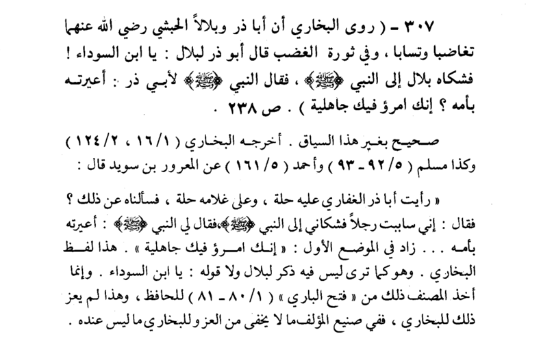 قال الألباني رحمه الله تعالى :"صحيح بغير هذا السياق، أخرجه البخاري ومسلم وأحمد عن المعرور بن سويد قال: رأيت أبا ذر الغفاري عليه حلة، وعلى غلامه حلة، فسألناه عن ذلك؟ فقال: إني ساببت رجلاً فشكاني إلى النبي - صلى الله عليه وسلم -، فقال لي النبي - صلى الله عليه وسلم -: "أعيرته بأمه..." زاد في الموضع الأول:"إنك امرؤ فيك جاهلية". هذا لفظ البخاري. وهو كما ترى ليس فيه ذكر لبلال ولا قوله: يا ابن السوداء. ففي صنيع المؤلف -القرضاوي- ما لا يخفى من العزو للبخاري ما ليس عنده" إهـ. [غاية المرام (ص 188) ]