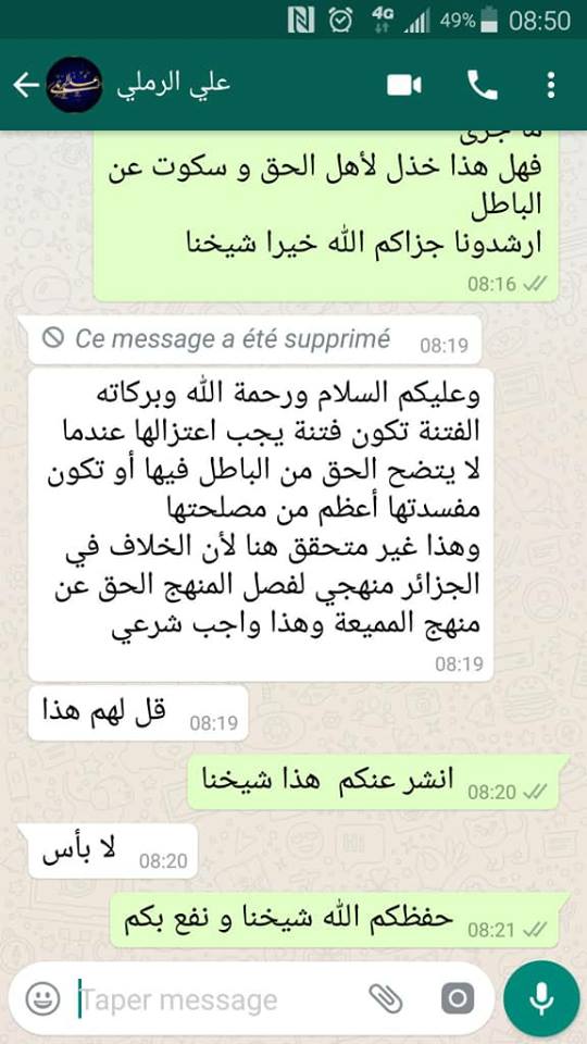 افتراضي [جديد]: الشيخ علي الرملي : عندكم الشيخ فركوس من كبار العلماء وهو أعلم بواقع الجزائر وما يحدث فيها من غيره .