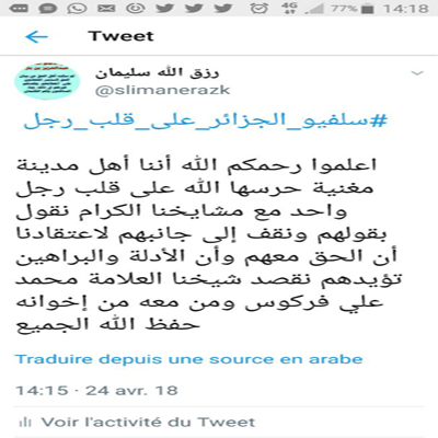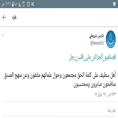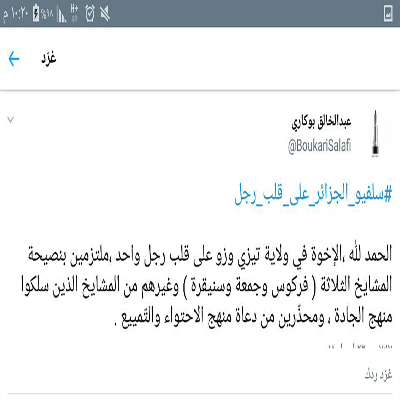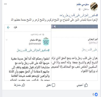 ويظهر في هذه الصور التي تضمنت ما نشره أحد الإخوة -جزاه الله خيرا- من (هاشتاج) في تويتر ومواقع تواصل اخرى ،والذي عنون له بـ " سلفيو الجزائر على قلب رجل واحد" أن السلفية منهج قائم على اتباع الكتاب والسنة على فهم سلف الأمة، وأن ما وافق هذا الأصل فهو الحق وما خالفه فهو الباطل، والآن أدعكم لقراءة ما في الصور فهو حقيقة مثلج للصدور ومعين لمن جهل هذه الأمور، فالثبات الثبات يا إخواننا.