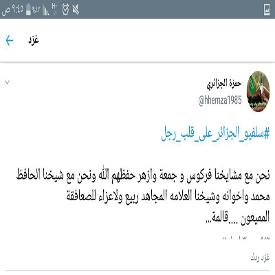 وكذلك الاخوة السلفيين في مدينة وادي العلايق¨ الحبيبة ولاية البليدة على قلب رجل واحد مع الشيخ العلامة فركوس والشيخين جمعة وازهر حفظهم الله جميعا