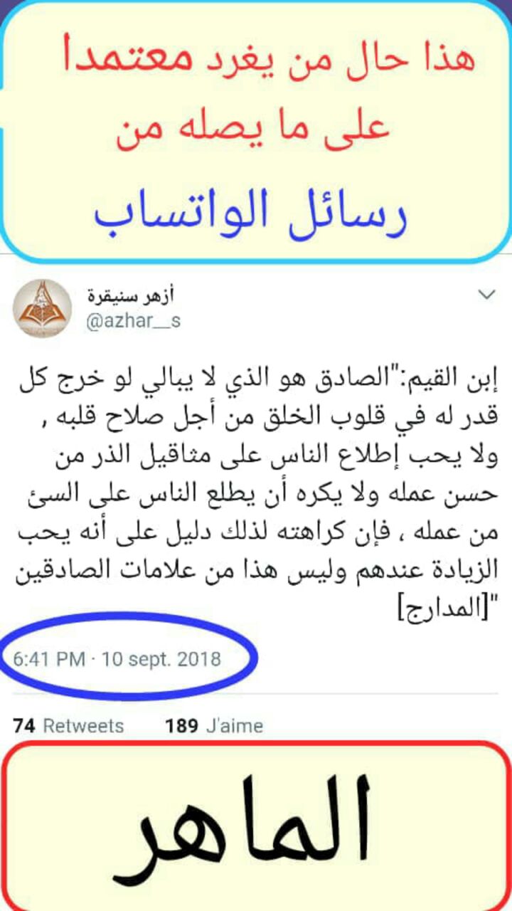 وأزهر -أصلحه الله- نقل كلام ابن القيم (في نظره) ولم يتبين له وجه القول ولا معناه (الفاسد) لذلك نقله مستدلا به مغترا بنسبته إلى ابن القيم وهذه مصيبة، والكلام قد اشتمل على حق وباطل كما بين ابن القيم ذلك، وإذا كان حذف التغريدة بعد علمه أن الكلام للمحاسبي وليس لاشتماله على الباطل خصوصا و أن أزهر لم يبين ولم يوضح ولم يعلن وتوبته وينشر تراجعه، وهذه هي المصيبة الأعظم