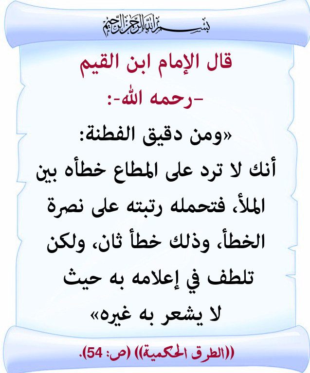 (ومن دقيق الفطنة أنك لا ترد على المطاع خطأه بين الملأ ، فتحمله رتبته على نصرة الخطأ ، وذلك خطأ ثانٍ ، ولكن تلطف في إعلامه به ، حيث لا يشعر به غيره).