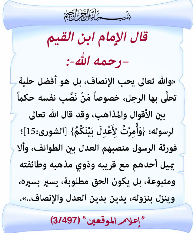 «والله تعالى يحب الإنصاف، بل هو أفضل حلية تحلَّى بها الرجل، خصوصاً مَنْ نَصَّب نفسه حكماً بين الأقوال والمذاهب، وقد قال الله تعالى لرسوله: {وَأُمِرْتُ لِأَعْدِلَ بَيْنَكُمُ} [الشورى:15]؛ فورثة الرسول منصبهم العدل بين الطوائف، وألا يميل أحدهم مع قريبه وذوي مذهبه وطائفته ومتبوعة، بل يكون الحق مطلوبة، يسير بسيره، وينزل بنزوله، يدين بدين العدل والإنصاف..».