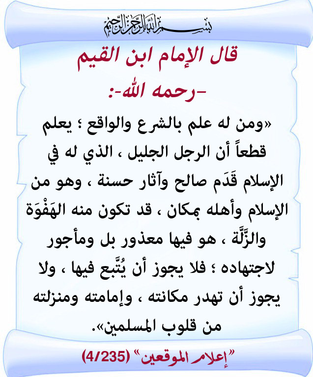 " ومن له علم بالشرع والواقع يعلم قطعا أن الرجل الجليل الذي له في الإسلام قدمٌ صالح وآثار حسنة وهو من الإسلام وأهله بمكان قد تكون منه الهفوة والزلة هو فيها معذور بل مأجور لاجتهاده، فلا يجوز أن يتبع فيها ولا يجوز أن هدر مكانته وإمامته ومنزلته في قلوب المسلمين "