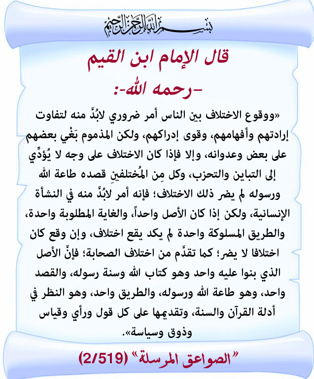 «ووقوع الاختلاف بين الناس أمر ضروري لابُدَّ منه لتفاوت إرادتهم وأفهامهم، وقوى إدراكهم، ولكن المذموم بَغْي بعضهم على بعض وعدوانه، وإلا فإذا كان الاختلاف على وجه لا يُؤدِّي إلى التباين والتحزب، وكل مِن المُختلفينِ قصده طاعة الله ورسوله لم يضر ذلك الاختلاف؛ فإنه أمر لابُدَّ منه في النشأة الإنسانية، ولكن إذا كان الأصل واحداً، والغاية المطلوبة واحدة، والطريق المسلوكة واحدة لم يكد يقع اختلاف، وإن وقع كان اختلافا لا يضر؛ كما تقدَّم من اختلاف الصحابة؛ فإنَّ الأصل الذي بنوا عليه واحد وهو كتاب الله وسنة رسوله، والقصد واحد، وهو طاعة الله ورسوله، والطريق واحد، وهو النظر في أدلة القرآن والسنة، وتقديمها على كل قول ورأي وقياس وذوق وسياسة».