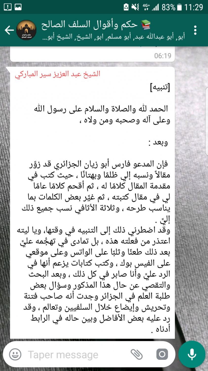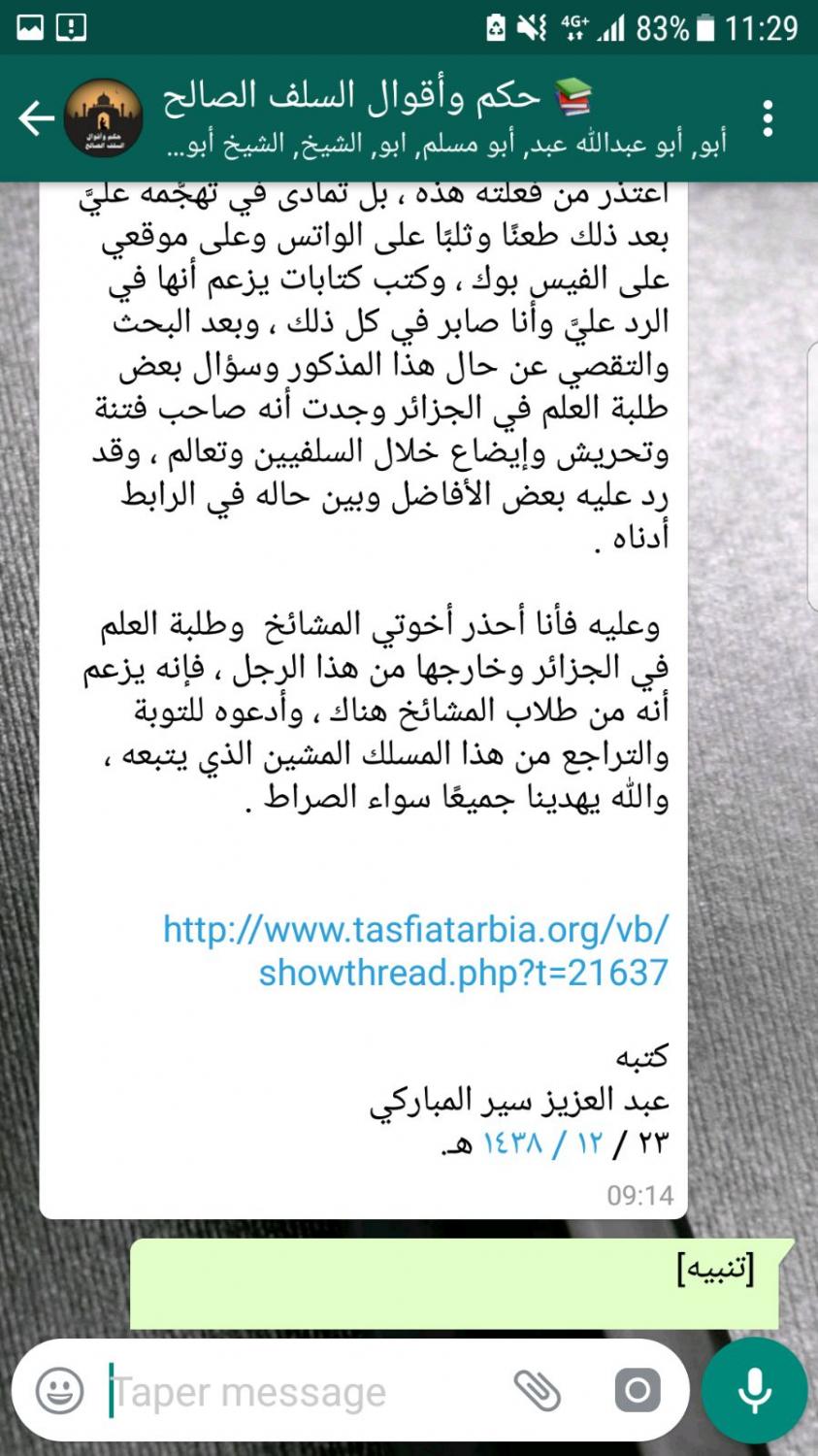 وقد اضطرني ذلك إلى التنبيه في وقتها، ويا ليته اعتذر من فعلته هذه ، بل تمادى في تهجُّمه عليَّ بعد ذلك طعنًا وثلبًا على الواتس وعلى موقعي على الفيس بوك ، وكتب كتابات يزعم أنها في الرد عليَّ وأنا صابر في كل ذلك ، وبعد البحث والتقصي عن حال هذا المذكور وسؤال بعض طلبة العلم في الجزائر وجدت أنه صاحب فتنة وتحريش وإيضاع خلال السلفيين وتعالم ، وقد رد عليه بعض الأفاضل وبين حاله في الرابط أدناه .