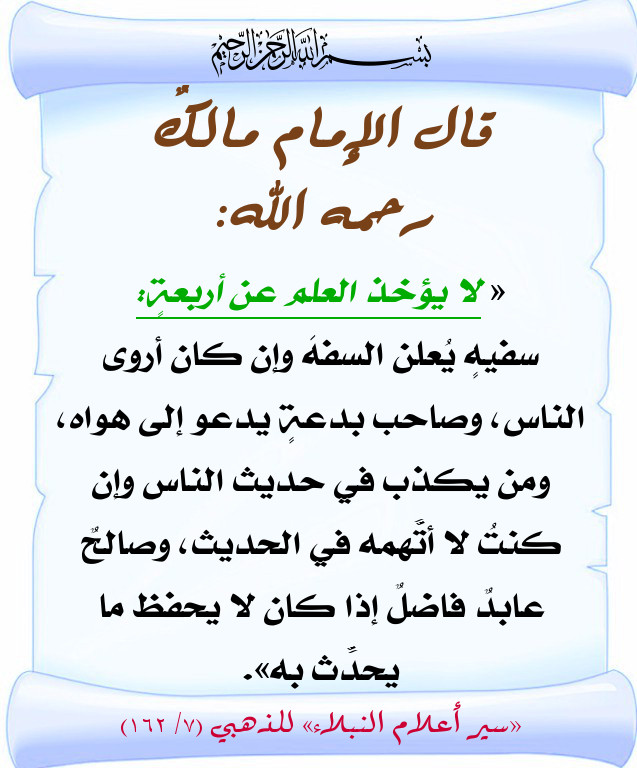 هذا أثر عن مالك ابن أنس رحمه الله الإمام المشهور ينهى فيه عن أخذ العلم عن أربعة أصناف من الناس وهم :