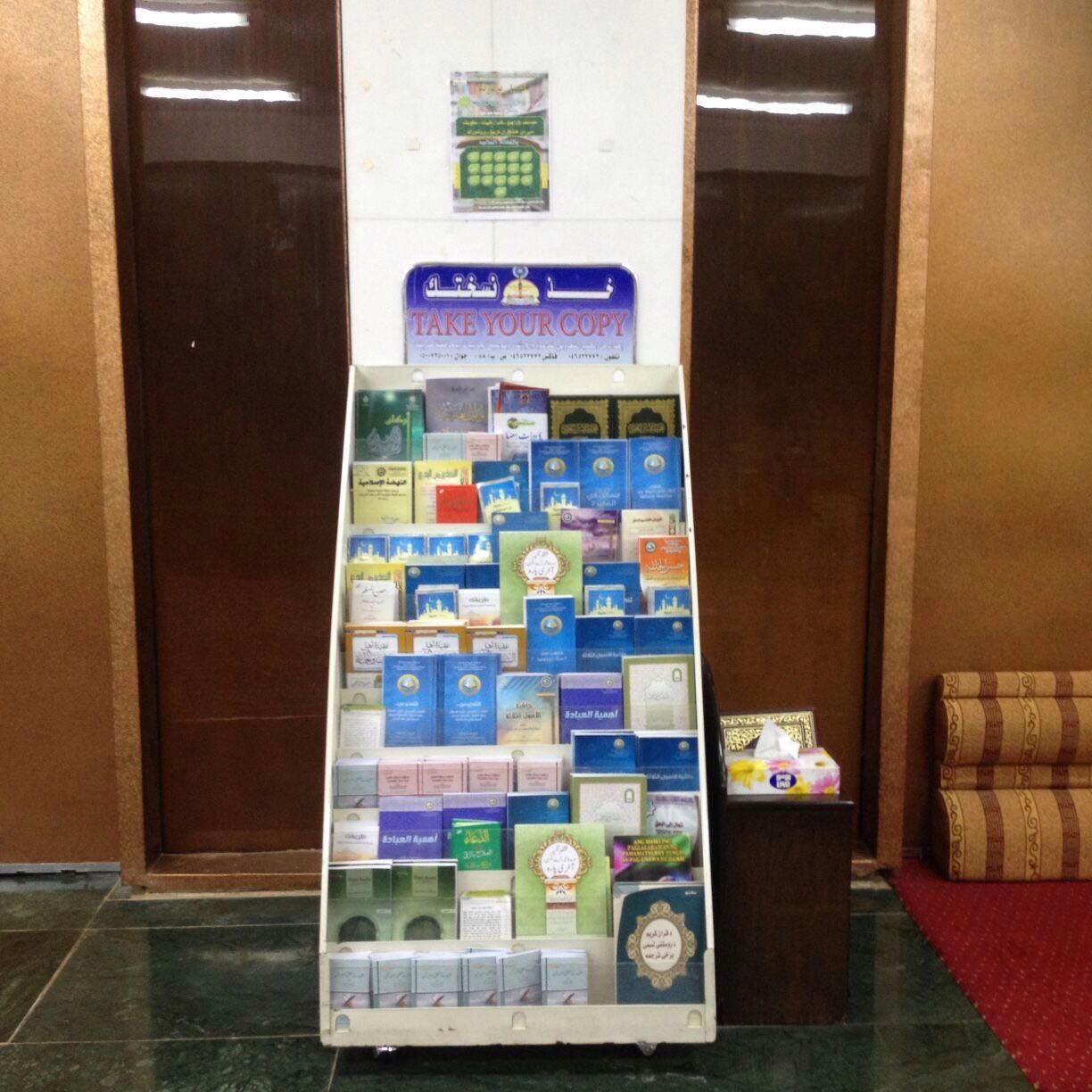 4- يتم ملء حامل المطويات كل مرة عن طريق كل من يريد المساهمة و التعاون من الاخوة حتى لا يصبح المشروع مكلفا و مرهقا لصاحب المحل .