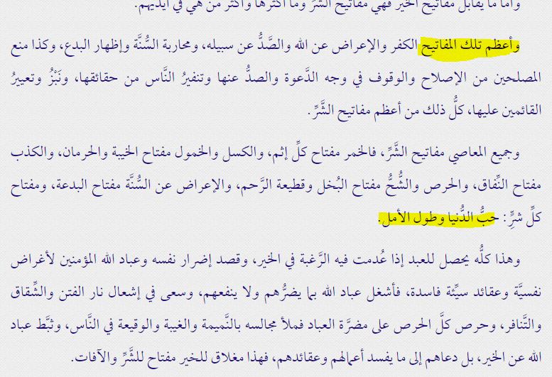 قال ابن القيم -رحمه الله-: «... ومفتاح كل شر حب الدنيا وطول الأمل... فإن الله سبحانه وتعالى جعل لكل خير وشر مفتاحا وبابا يدخل منه إليه كما جعل الشرك والكبر والأعراض عما بعث الله به رسوله والغفلة عن ذكره والقيام بحقه مفتاحا للنار وكما جعل الخمر مفتاح كل أثم وجعل الغنى مفتاح الزنا وجعل إطلاق النظر في الصور مفتاح الطلب والعشق وجعل الكسل والراحة مفتاح الخيبة والحرمان وجعل المعاصي مفتاح الكفر وجعل الكذب مفتاح النفاق وجعل الشح والحرص مفتاح البخل وقطيعة الرحم وأخذ المال من غير حله وجعل الأعراض عما جاء به الرسول مفتاح كل بدعة وضلالة وهذه الأمور لا يصدق بها إلا كل من له بصيرة صحيحة وعقل يعرف به ما في نفسه وما في الوجود من الخير والشر فينبغي للعبد أن يعتني كل الإعتناء بمعرفة المفاتيح وما جعلت المفاتيح له والله ومن وراء توفيقه وعدله له الملك وله الحمد وله النعمة والفضل لا يسئل عما يفعل وهم يسئلون ». « حادي الأرواح 49».