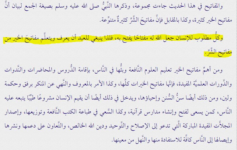 قال الدكتور -هداه الله وأصلحه-: « وأعظم تلك المفاتيح الكفر والإعراض عن الله والصَّدُّ عن سبيله، ومحاربة السُّنَّة وإظهار البدع، وكذا منع المصلحين من الإصلاح والوقوف في وجه الدَّعوة والصدُّ عنها وتنفيرُ النَّاس من حقائقها، ونَبْزُ وتعييرُ القائمين عليها، كلُّ ذلك من أعظم مفاتيح الشَّرِّ.