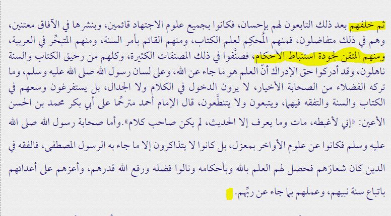 قال الدكتور -هداه الله وأصلحه-: « ثم خلفهم بعد ذلك التابعون لهم بإحسان، فكانوا بجميع علوم الاجتهاد قائمين، وبنشرها في الآفاق معتنين، وهم في ذلك متفاضلون، فمنهم المُحكِم لعلم الكتاب، ومنهم القائم بأمر السنة، ومنهم المتبحِّر في العربية، ومنهم المتقن لجودة استنباط الأحكام».« الهمة في طلب العلم ».