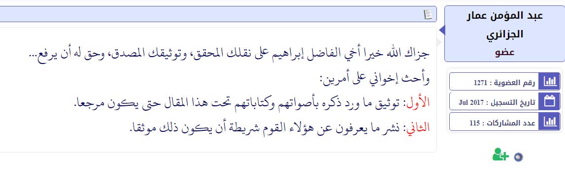 والملاحظ على تعليق الخنفشار: أوّلا: كذبه في الثناء على مقال بويران فهو من جهة يصفه بالتوثيق المصدّق ومن جهة يطالب الأعضاء بتوثيق نقولاته! وهذه واحدة من غرائب وعجائب المفرقين!