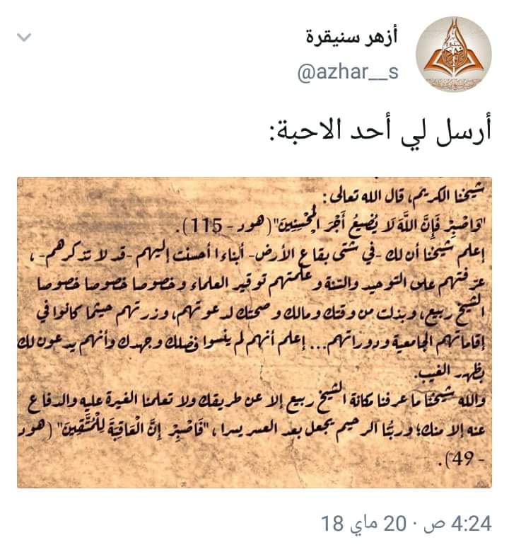 أزهر سنيقرة@azhar__s/ 5:14 PM · 17 mai 2018 لا عليك ما يفعله الكذابون، لو أراد الله رفعك ما قدروا على اسقاطك ولو اجتمعوا جميعا، وأما الشيخ العلامة ربيع السنة ستظهر له حقيقتهم بإذن الله تعالى،