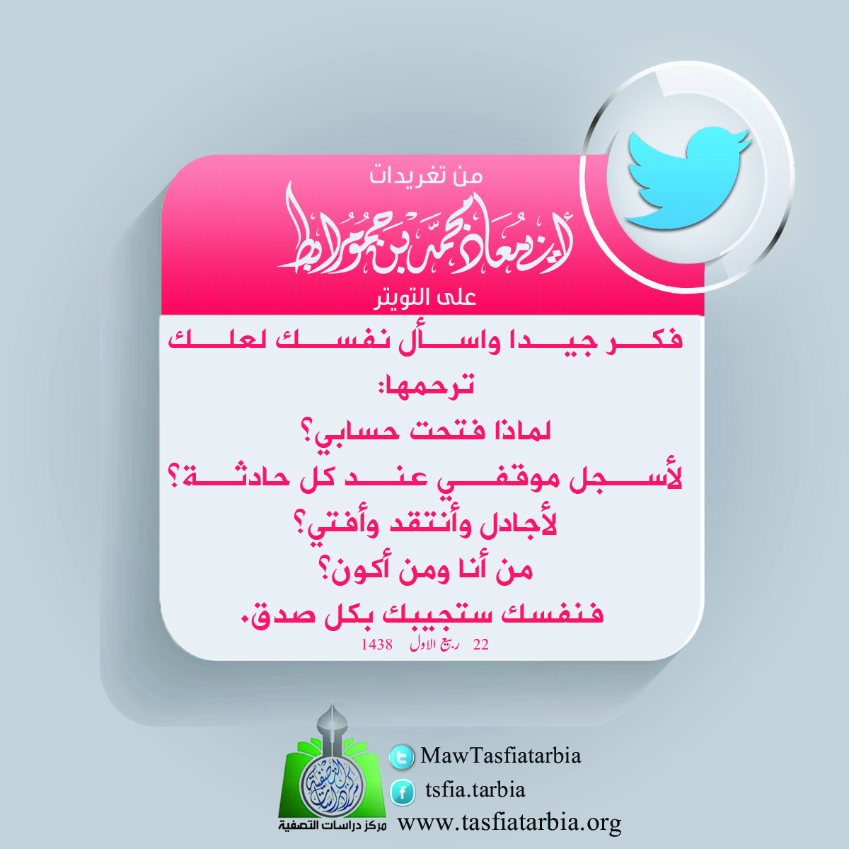 فكر جيدا واسأل نفسك لعلك ترحمها: لماذا فتحت حسابي؟ لأسجل موقفي عند كل حادثة؟ لأجادل وأنتقد وأفتي؟ من أنا ومن أكون؟ فنفسك ستجيبك بكل صدق.