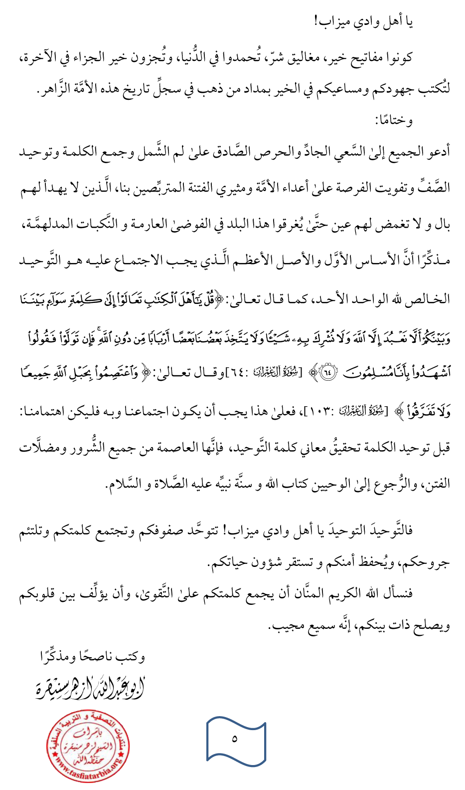 نسأل الله عزوجل أن تجد هذه النصيحة وهذا النداء آذان صاغية، وقلوبا واعية، ونسأله سبحانه بأسمائه الحسنى وصفاته العلا أن يحفظ بلادنا من كيد الكائدين وحقد الحاقدين،وأن يجعله بلدا آمنا مطمئنا وسائر بلاد المسلمين وأن يجمعنا على الكتاب والسنة بفهم سلفنا الصالح رضوان الله عليهم أجمعين.