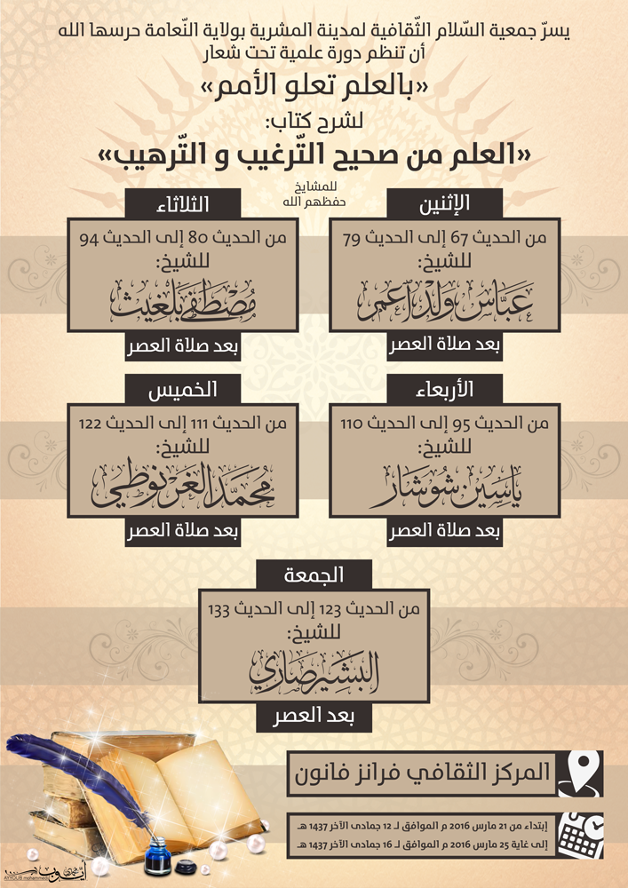 قال العلاّمة عبد الحميد بن باديس رحمه الله وغفر لـه : اتَقُوا الله، ارحَمُوا عِبَاد الله، اخْدُمُوا العلم بِتَعَلُّمِه ونَشْرِه، وتَحَمَّلُوا كلَّ بلاءٍ ومَشَقَّةٍ في سَبِيلِهِ، ولْيَهُنْ عليكم كلُّ عزيزٍ ، ولْتَهُنْ عليكم أَرْواحُكُم من أَجْلِهِ، أمَّا الأُمورُ الحُكُومِيَّةُ وما يَتَّصِلُ بها فَدَعُوها لِأَهْلِهَا، وإيَّاكُمْ أن تَتَعَرَّضُوا لها بِشَيْء. [آثار الإمام ابن باديس ٢٢٣/٣]