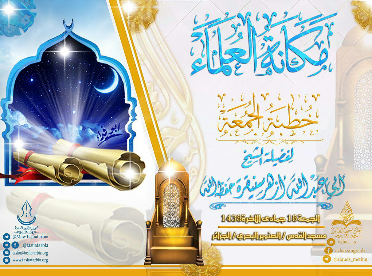 افتراضي [خطبة جمعة] 🌿مكانة العلماء🌿، لفضيلة الشيخ أبي عبد الله أزهر سنيقرة حفظه الله ورعاه/ 18جمادى الآخر 1438 هجرية