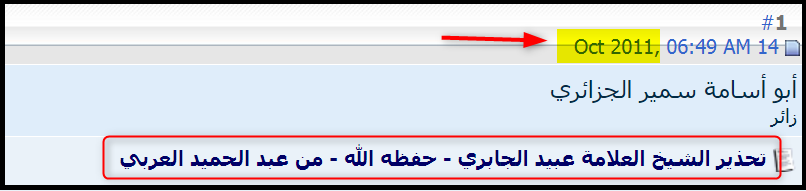 السؤال الثالث: قبل أن يلتقي بك عبد الحميد العربي كتب ردّا على العلاّمة عبيد الجابري –حفظه الله- بعنوان: «مازالوا بالشيخ عبيد الله الجابري حتى قال ما قال بلا دليل ولا برهان»، كتبه «يوم الجمعة 16 ذي القعدة 1432هـ، الموافق لـ 14أكتوبر2011نصراني»، وطعن فيه مطاعن شديدة في العلاّمة عبيد، منها على سبيل المثال: «تزكيتُك لرجلين من الجزائر في المكالمة الهاتفية مغامرة كبيرة ومقامرة خاسرة وهو غش للمسلمين في الجزائر».