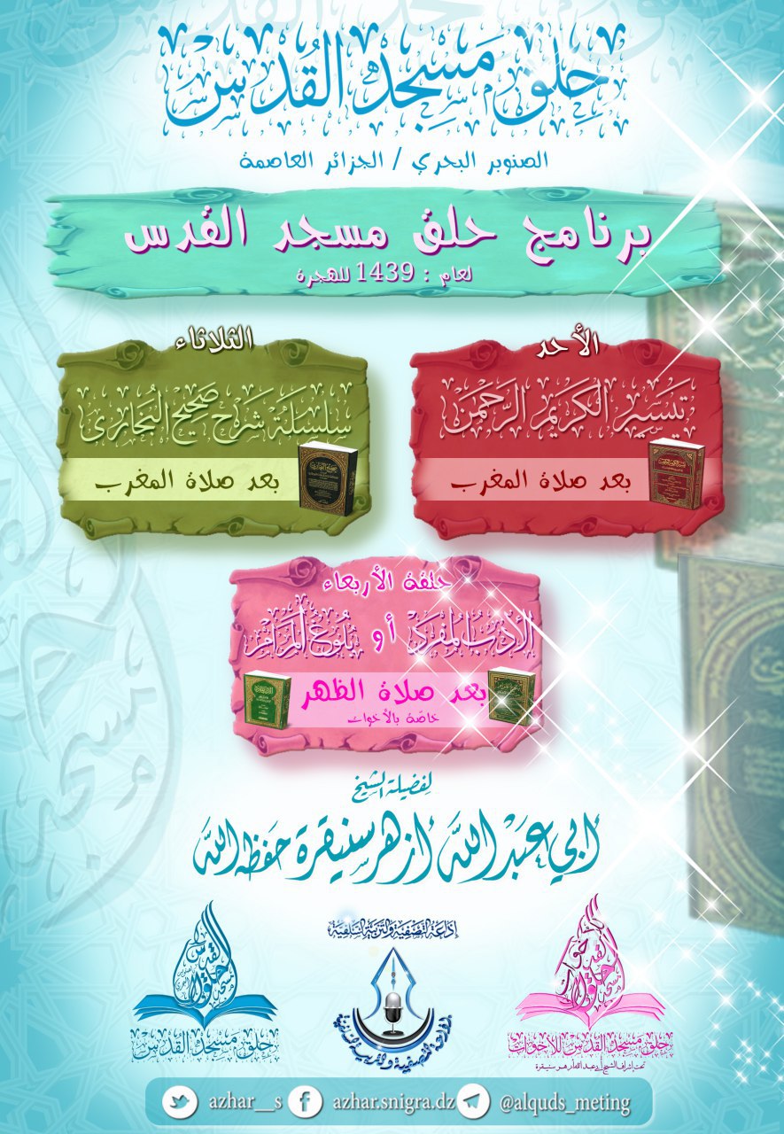 http://4.bp.blogspot.com/-SNmDZ5gQzZ...asmala.svg.png يسر إخوانكم بموقع التَّصْفِيَةِ وَ التَّرْبِيَةِ السَّلَفِيَةِ و قَنَاةِ حِلَقِ القُدْس أن يبشروا الجميع ، بعودة الدروس الأسبوعية إبتداءا من يوم: الثلاثاء 18 صفر 1439 لفضيلة شيخنا الوالد أبي عبد الله أزهر سنيقرة - حفظه الله تعالى - ، وفق البرنامج المرفق في البطاقة http://www.tasfiatarbia.org/vb/attac...1&d=1509816728 • سيكون البث - بإذن الله تعالى - متوفر عبر الإذاعة الرئيسية لموقع التصفية و التربية السلفية |