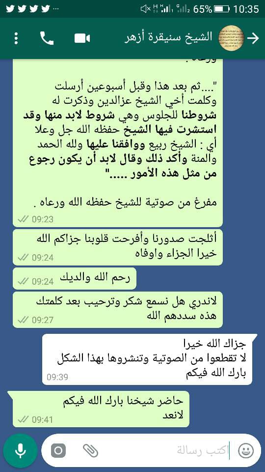 إن الحمد لله نحمده ونستعينه ونستغفره ..... هذه كلمة مقتضبة وتعقيب على الصوتية التي نشرها الشيخ عزالدين والتي عنون لها ب " شكر وترحاب لنصيحة الشيخ ربيع " حفظه الله تعالى ووفقه لما فيه الخير وإن كانت هذه نصيحة ثالثة أو رابعة من نصائح الشيخ في هذا الباب، وحتى لايفتح باب التقول على الشيخ عزالدين في كلمته أن هذه النصيحة يفرح بها كل من أراد خيرا لنفسه ودعوته ولايعرض وينفر منها إلا كل من أراد الشر لنفسه ودعوته وأن يقصد بها إخوانه وعلى رأسهم الشيخ فركوس حفظه الله ورعاه وسدد على الحق خطاه نقول إحقاقا للحق وتتمة لهذه الكلمة والتي أبدؤها بكلام طيب قرأته لأخي محمد مزيان في تغريدته البارحة " من شكر الله شكر الناس، ومن أركان الشكر العمل الصالح: اعملوا آل داود شكرا. والعمل الصالح لابد فيه من إخلاص مع المتابعة، مع صدق فيه بمطابقة أدائه لما عزم عليه لأن المقصود من كلام الشيخ فركوس هو هذا العمل لا أن نشكره على نصائحه ، حياته وأنفاسه وكلماته ودروسه كلها نصيحة من هذا الشيخ ومن جميع مشايخنا الحريصين على هذا الخير والحريصين على الاجتماع على الحق دائما وأبدا وهذا الذي سعينا فيه مع إخواننا من أول يوم ولكن مع الأسف الشديد إخواننا يذكرون أنهم طالبونا بالجلوس وأبينا عليهم و لايصرحون أننا اشترطنا عليهم و لا يذكرون شرطنا لهم ، وكان شرطا واحدا و شرطا أوليا مرّ عليه أشهر ولم يتصل بي أحد منهم البتة . وقبل شهر اتصل بي أحد إخواننا الطيبين المحبين للدعاة إلى الله عز و جل ، أراد خيرا وسعى فيه ، وسألني بالله أن لا أرد له طلبه فقلت له سأجيب لك طلبك فاسأل ، قال : أريدك أن تجلس مع عبد الخالق ، فقلت له مرحبا بك وبه عندي في بيتيو، وكان قد ألح على أخي "عبد الخالق " في هذا الباب إلى أنه لما أخبره أن" أخاه" قد وافق على اللقاء قال لي أنه انتفض وغضب وقال والله لا أجلس معه ، هذه لايذكرونها لماذا لا يذكر الشيخ عزالدين اني اشترطت شرطا واحدا أن هذا الذي أساء إلينا وفي عقر دارنا وتحت سقف بيتنا تجرأ علينا وتحدانا جميعا في قوله في تغريدته ( الشيخ عبد المالك رمضاني شيخي وحبيبي ) ، شيخك ، حبيبك ، سيدك ، ولي أمرك ، هذا نحن لايهمنا وانت لاتهمنا - بالنسبة لهذا القائل - ولكن أن يبقى معنا وهذا شيخه الطاعن في علمائنا وأئمتنا هذا الطعن والحمد لله أقر به المشايخ الفضلاء بعد مدة طويلة وبعد سكوت مطبق... ولكن هذا أمر الله جل وعلا نسأل الله تبارك وتعالى الإخلاص والصدق في كل أعمالنا ثم بعد هذا وقبل أسبوعين أرسلت وكلمت الشيخ عزالدين وذكرت له شروطنا و هي شروط لا بد منها واستشرت فيها الشيخ ربيع حفظه الله جلا وعلا ووافقني عليها ولله الحمد و المنة ، وأكد عليها ، و قال لابد أن يكون الرجوع من هذه الأمور كانوا يُلبِّسون أنهم لا يزكون هذا المنحرف ثم فُضح الأمر وخرجت الصوتيات ، هذا الذي خرج أما المخفي فالله تبارك وتعالى هو العالم به ثم أقول و أكرر و لا أطيل ، المقصود من كلام العلماء لا أن نثني عليها و أن نشكرهم على صنيعهم فيها وهم مشكورون مأجورون عند الله تبارك وتعالى نظن هذا ونحسبه لهم ، ولكن المقصود بالدرجة الأولى هو السعي الصادق والعمل الخالص والصدق مع الله تبارك وتعالى و والله لسنا من الذين يعرضون عن أي خير و عن أي أمر فيه خير لا أنا و لا شيخنا و لا أخي الشيخ عبد المجيد ولا أخي الشيخ نجيب كلنا ولله الحمد والمنة على قلب رجل واحد بدليل اننا سعينا مع الشيخ عبد الغني الذي كانت له تصرفات ساءتنا جدا كتزكيته لهؤلاء الغلمان الذين أفسدوا في هذا الأمر فسادا عظيما ، وما زال فسادهم يسري في ساحتنا ولا منكر عليهم ألم يكن الأولى من الشيخ عزالدين لما حضر وليمة ودعوة ذلك المفتري الذي تطاول على شيخنا أن يؤدبه على مرأى ومسمع ممن كان حولهم ، هذا الواجب ياإخوة الواجب علينا الصدع بالحق . أنا كان دعاني مرة أخي سليم الذي فتح الله عليه ببناء المدرسة القرأنية في الدويرة وقدمني لإلقاء كلمة في المسجد الذي إمامه معروف عندكم والذي تزكونه رغم طعنه فينا وطعنه في شيخنا وإظهاره لحلبيته وا