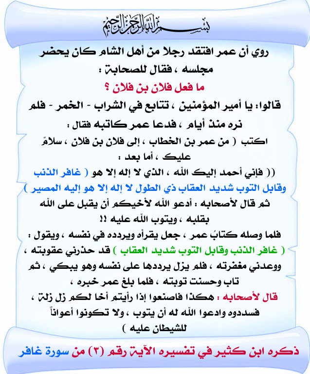 فقال : اكتب ( من عمر بن الخطاب ، إلى فلان بن فلان ، سلامٌ عليك ، أما بعد : (( فإني أحمد إليك الله ، الذي لا إله إلا هو ( غافر الذنب وقابل التوب شديد العقاب ذي الطول لا إله إلا هو إليه المصير )