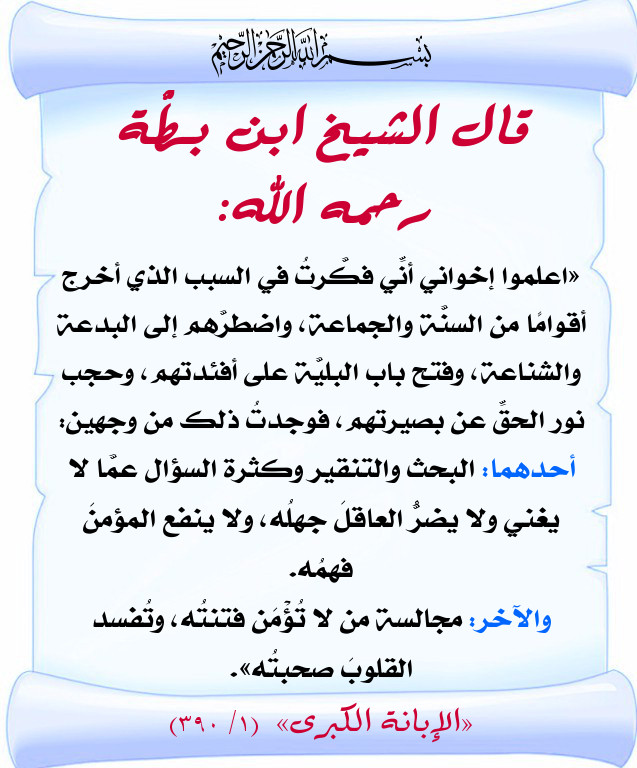 «اعلموا إخواني أنِّي فكَّرتُ في السبب الذي أخرج أقوامًا من السنَّة والجماعة، واضطرَّهم إلى البدعة والشناعة، وفتح باب البليَّة على أفئدتهم، وحجب نور الحقِّ عن بصيرتهم، فوجدتُ ذلك من وجهين: أحدهما: البحث والتنقير وكثرة السؤال عمَّا لا يغني ولا يضرُّ العاقلَ جهلُه، ولا ينفع المؤمنَ فهمُه. والآخر: مجالسة من لا تُؤْمَن فتنتُه، وتُفسد القلوبَ صحبتُه».